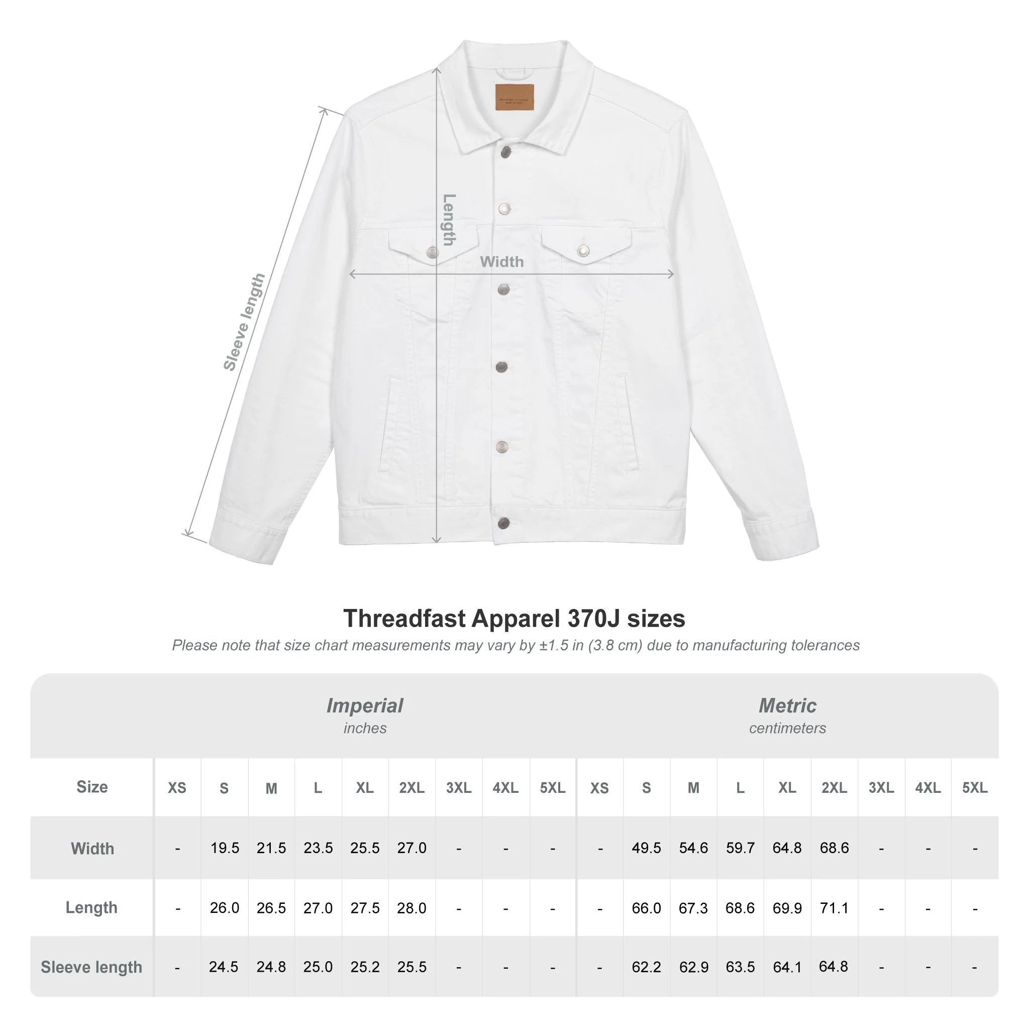 | Sleeve length, in | 24.50 | 24.75 | 25.00 | 25.25 | 25.50 |
